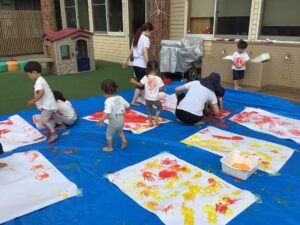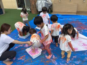 色とりどりの絵の具で手や足をペタペタ…感触に大喜び。